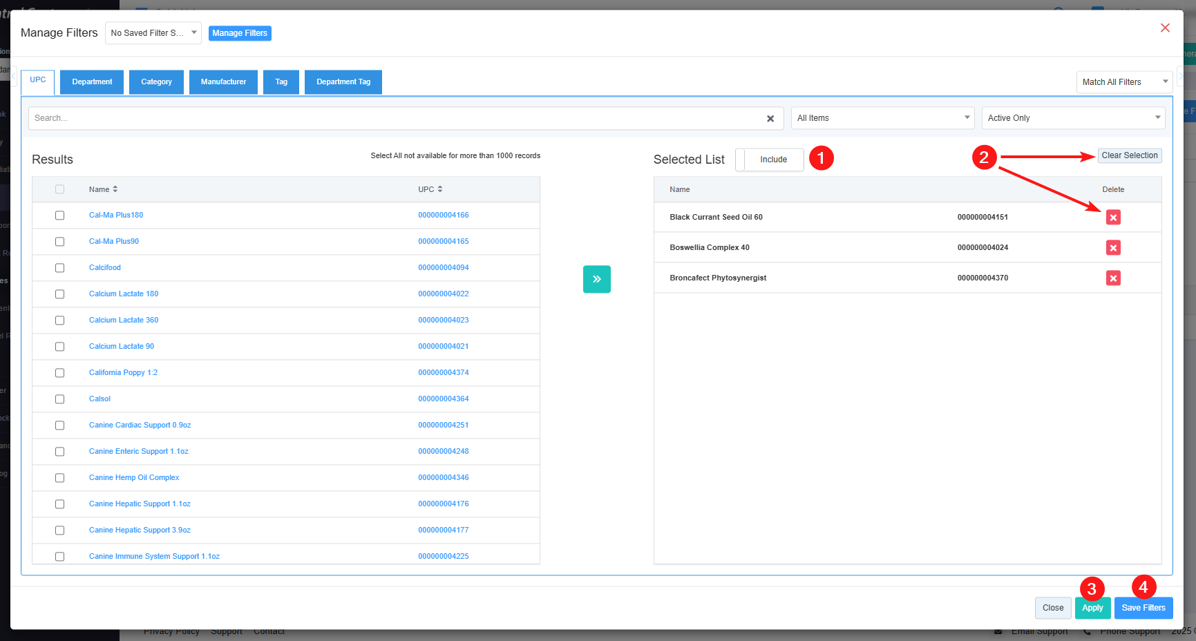 - 6: Active Only: Use this filter to filter the Manage Filters screen data based on three product parameters: Active Only, Inactive Only, and All Records. This filter is available only for the "UPC" tab.