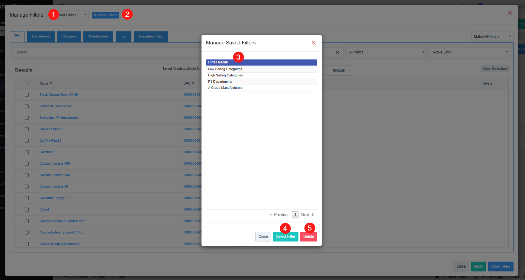 - 8: Results: Here, you see the relevant list of data on the Manage Filters screen for the selected tab. For example, if you have chosen the "UPC" tab, it will show the list of all UPCs. You can use the "Search" bar for a specific UPC. You will see the data accordingly if you have applied the 4, 5, 6, or 7 filters.