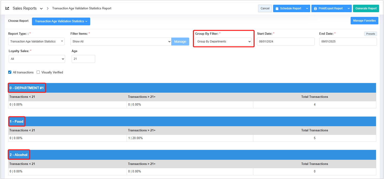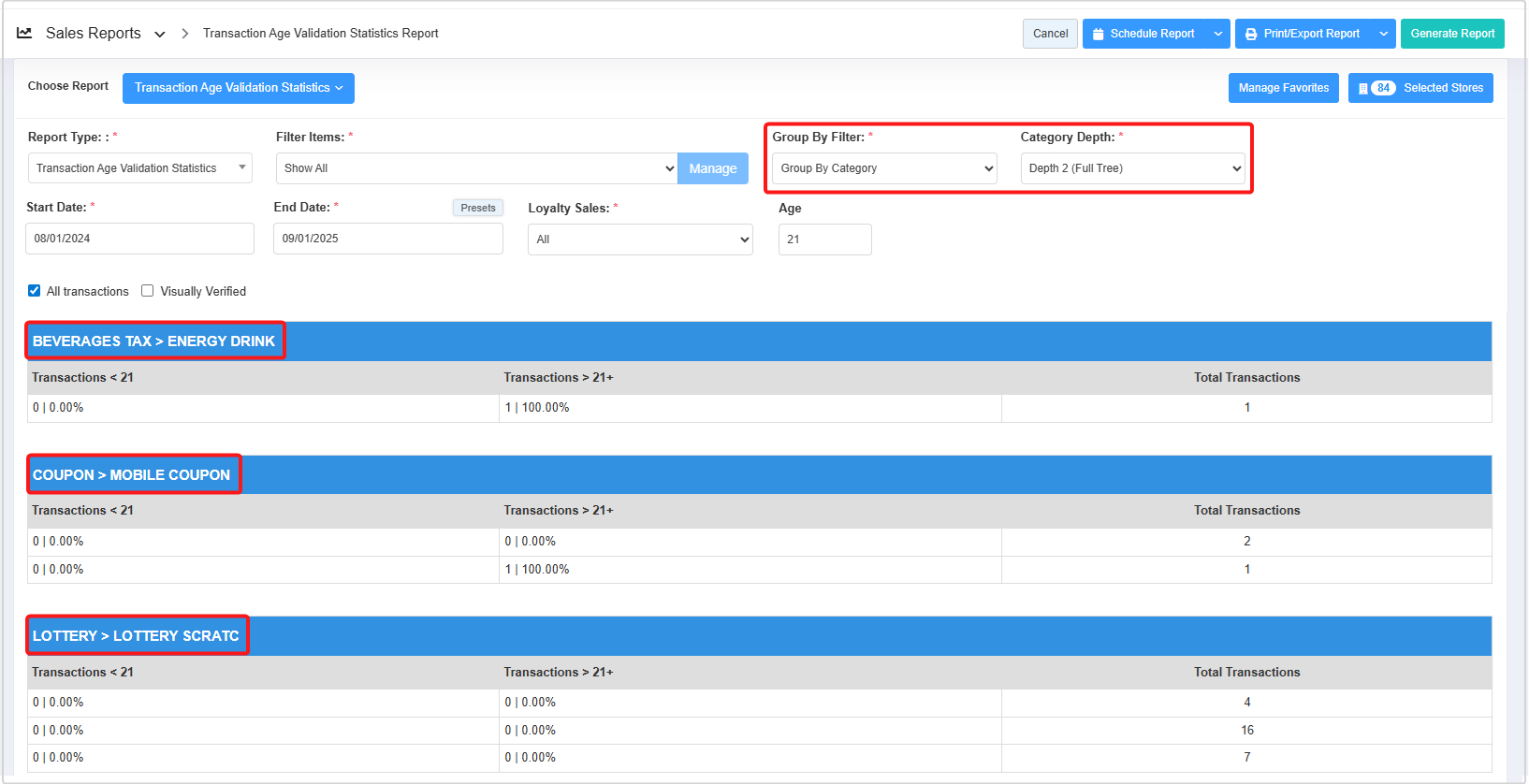 - Transaction <21: When the Age field is set to <21, this column shows the number of sales for age-restricted items made to customers younger than 21. The value is displayed in the format "X | Y%".