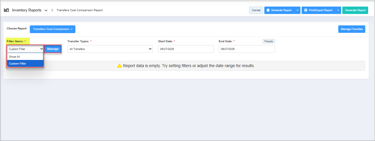 Let's understand the custom filter options to generate the Transfer Cost Comparison Report by setting up specific criteria. You can generate the Transfer Cost Comparison Report for all store locations with the "Show All" option or a customized report with "Custom Filter."