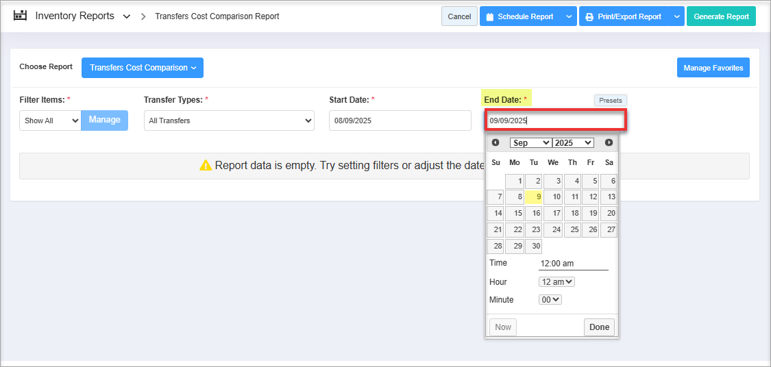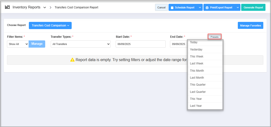 - Presets: The Presets label is provided to select the specific duration/interval to generate the Transfer Cost Comparison report according to the specified time period.