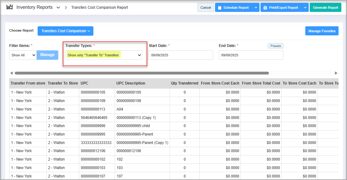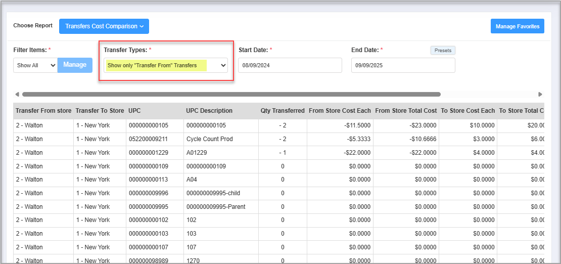 The "Transfer Cost Comparison Report" provides detailed insights into product transfers across all store locations within your company. It is designed to help you compare the cost and quantity of products moved between various locations.