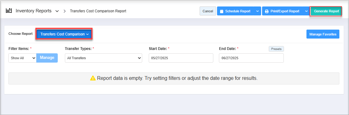 - The system will redirect you to the Transfer Cost Comparison Report home screen.
