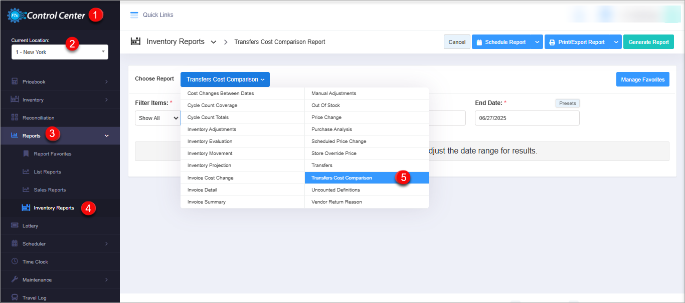 To reach the "Transfer Cost Comparison Report," follow the steps below: