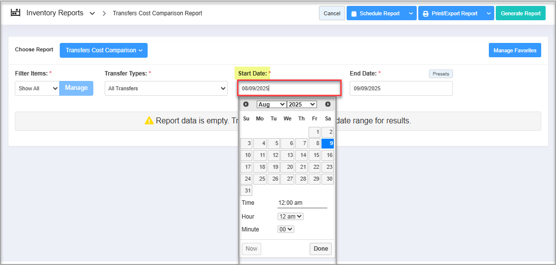 - Start Date: Pick the Start Date for the transfer time period from the associated drop-down calendar.