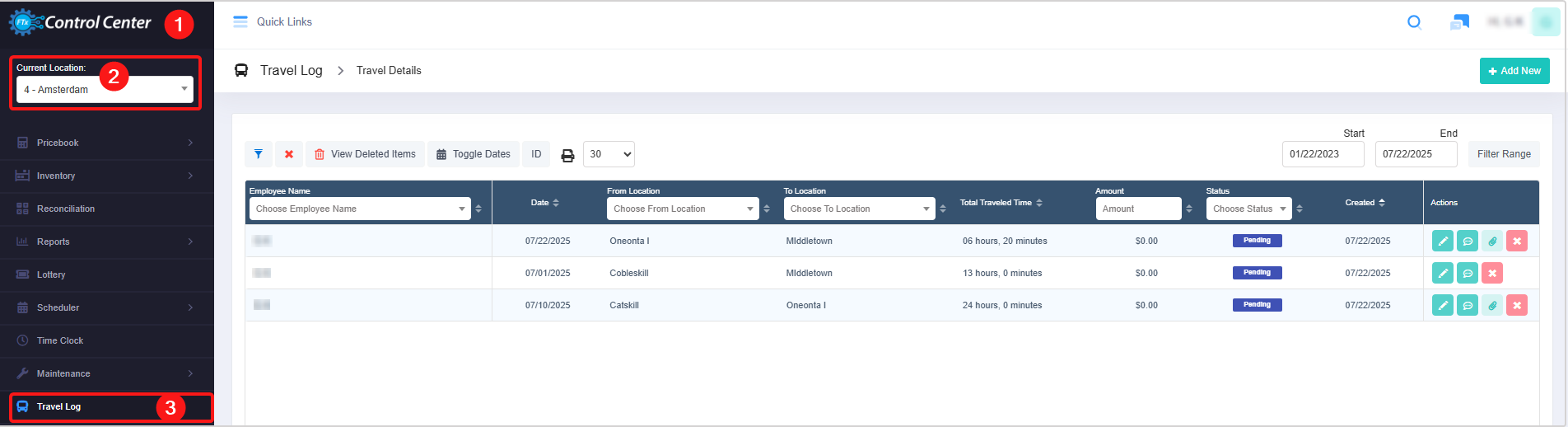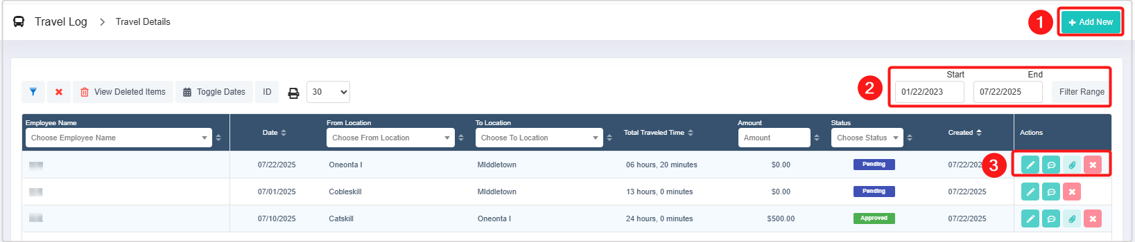 - 2: Filter Range: This button lets you see the travel entry records for the selected date range. Select the required dates in the Start and End fields and click the "Filter Range" button to see the travel entry records for the selected date range.