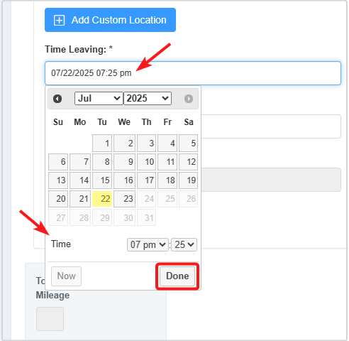 - Time Leaving: Select or enter the travel's start time. When you click on this field, the Calendar drop-down will appear. You can use the Time section to select the time.