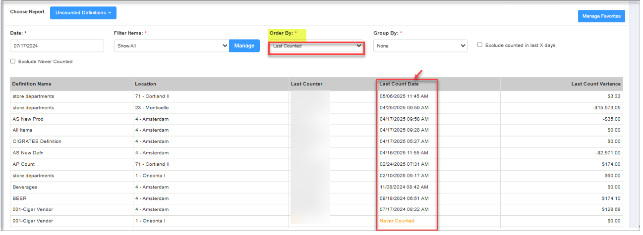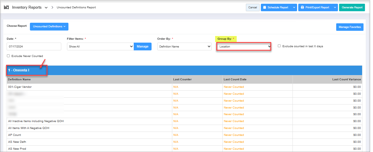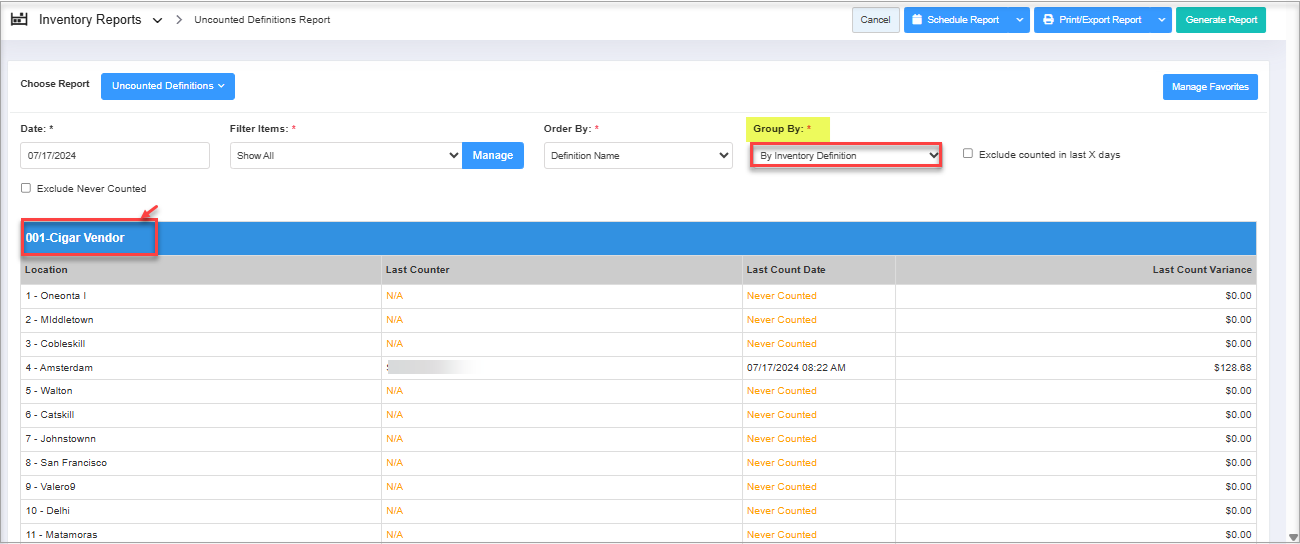 Location: Groups the uncounted definition data by store or site location, allowing you to analyze which locations have pending counts more efficiently. This helps in identifying areas that may require immediate attention.