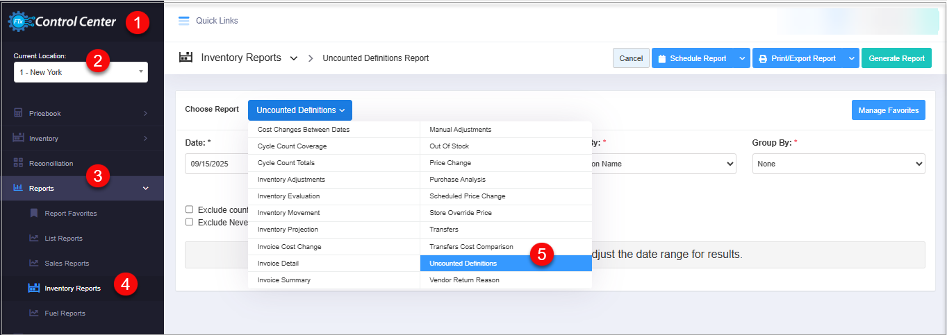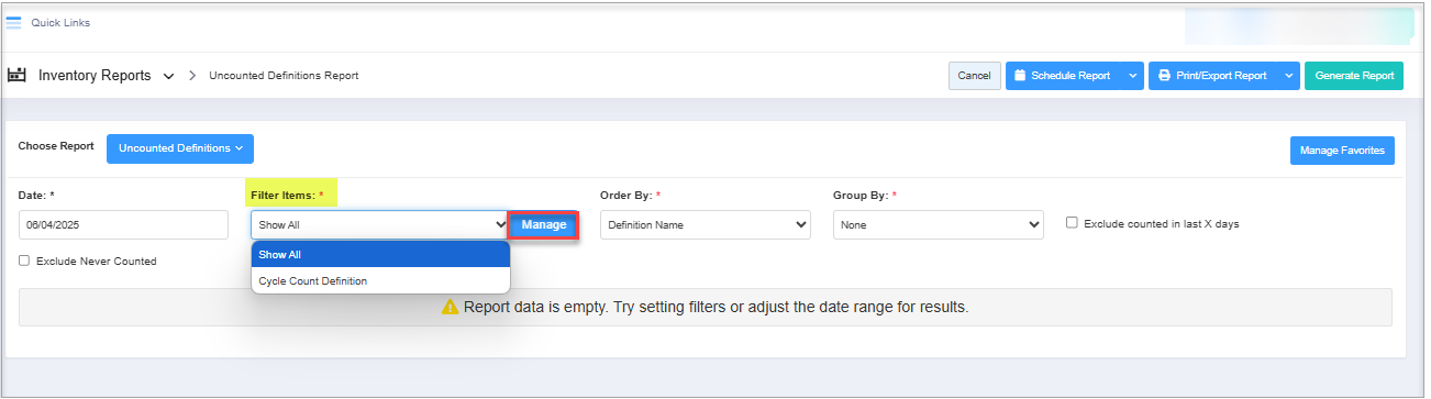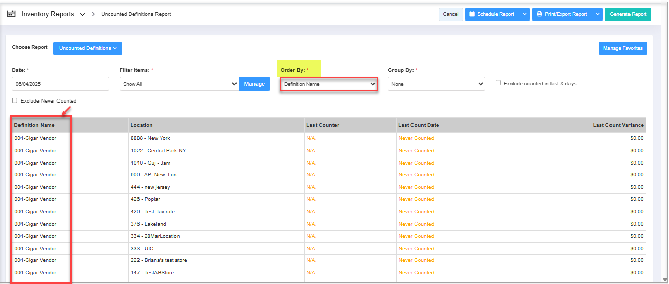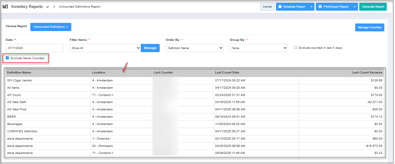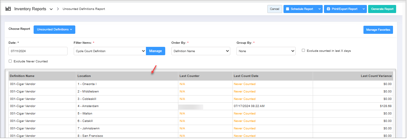 The Uncounted Definitions Report displays a comprehensive list of all inventory definitions — whether or not they were used during a cycle count. It helps identify which definitions were utilized and which remained unused throughout the cycle count process. It also helps organize cycle count definitions by location and includes details such as the last count date, variance, and counter.