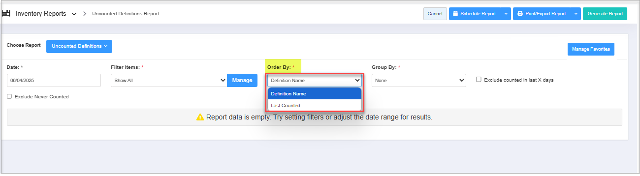 This field allows you to organize and view the uncounted definition report based on your preferred sorting criteria. You can choose from the following options: