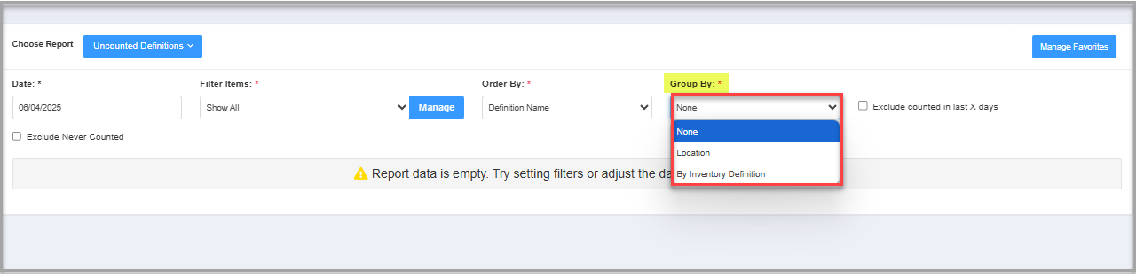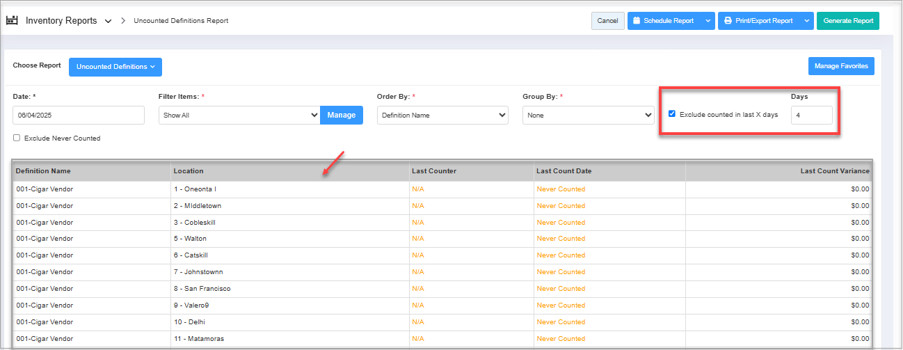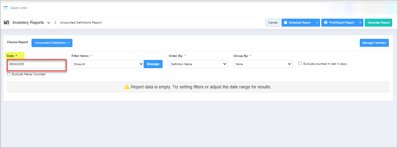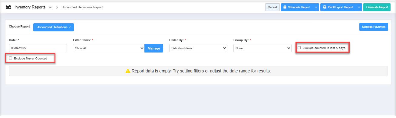 Figure 4.1 - Exclude Counted in Last X Days: This checkbox allows you to filter out records that have been recently counted. When enabled, and a specific number of days (X) is entered, the report will exclude any definitions that were counted within that time frame. This is useful when you want to focus only on older or long-overdue uncounted definitions, helping prioritize areas that haven't been reviewed recently.