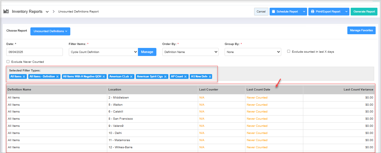 These filters help you tailor the Uncounted Definition Report to suit specific analysis needs — whether it’s focusing on long gaps between counts or excluding entries with no count history altogether.