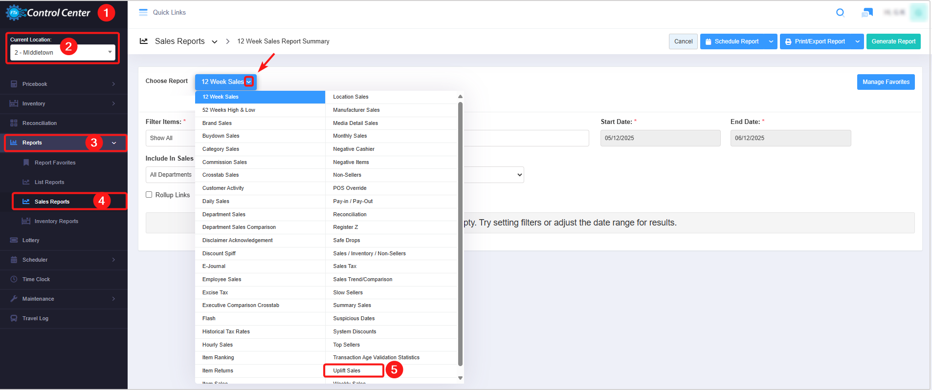 When you click "Uplift Sales," the Uplift Sales Report screen will open. As shown in Figure 1.2, it provides relevant filtering and sorting options.