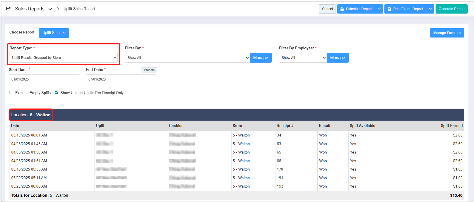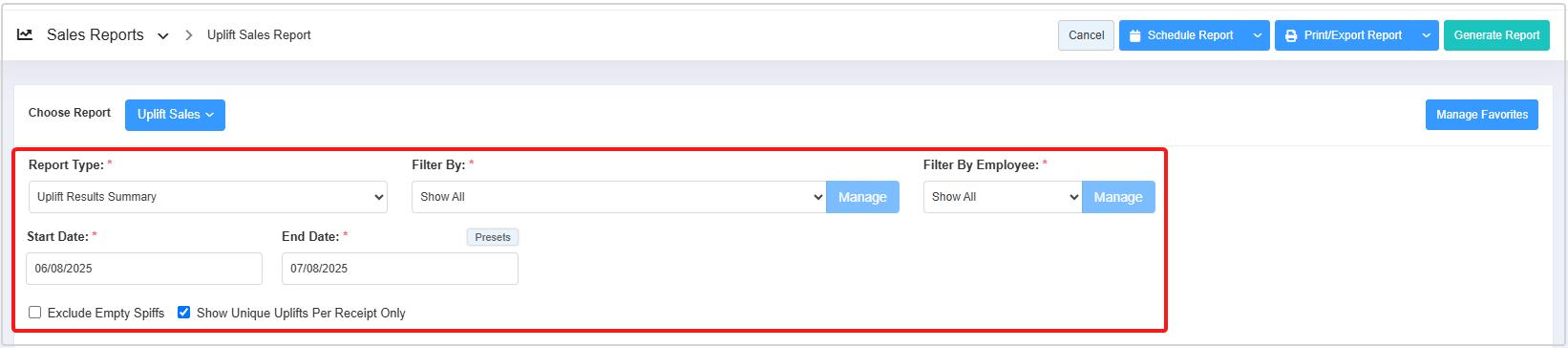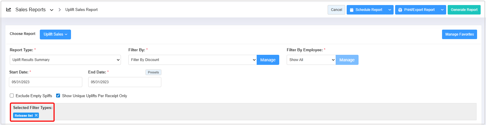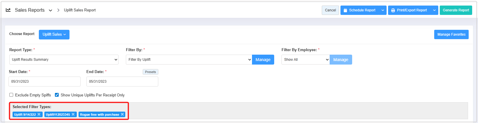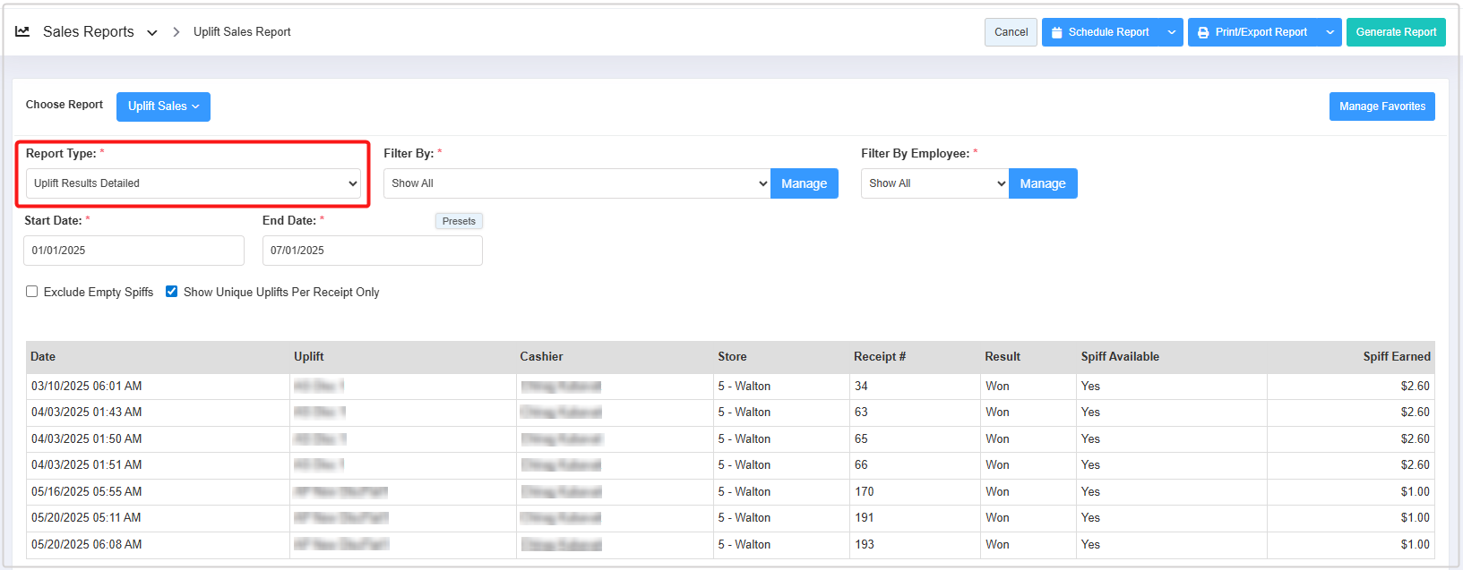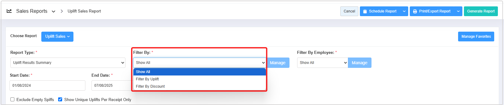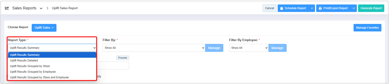 - Report Type: The Report Type filter lets you generate five types of reports: Uplift Results Summary, Uplift Results Detailed, Uplift Results Grouped by Store, Uplift Results Grouped by Employee, and Uplift Results Grouped by Store and Employee. 3.1 Report Type explains further details.