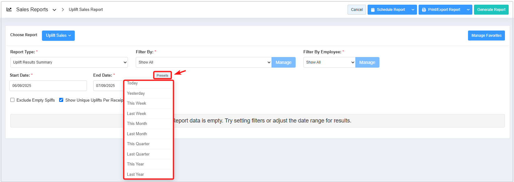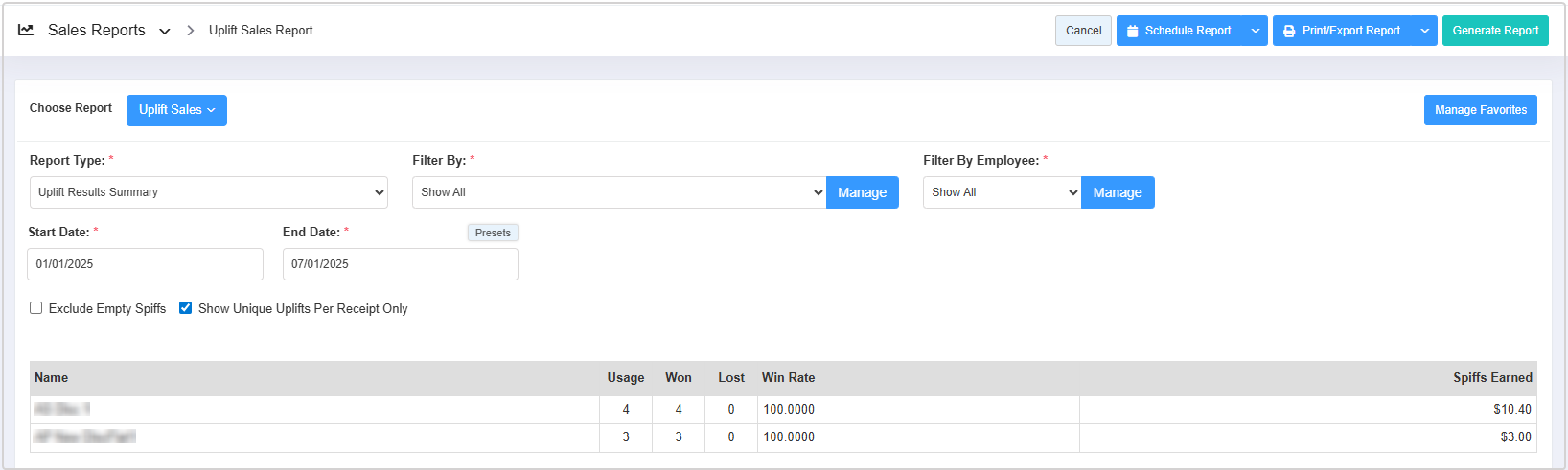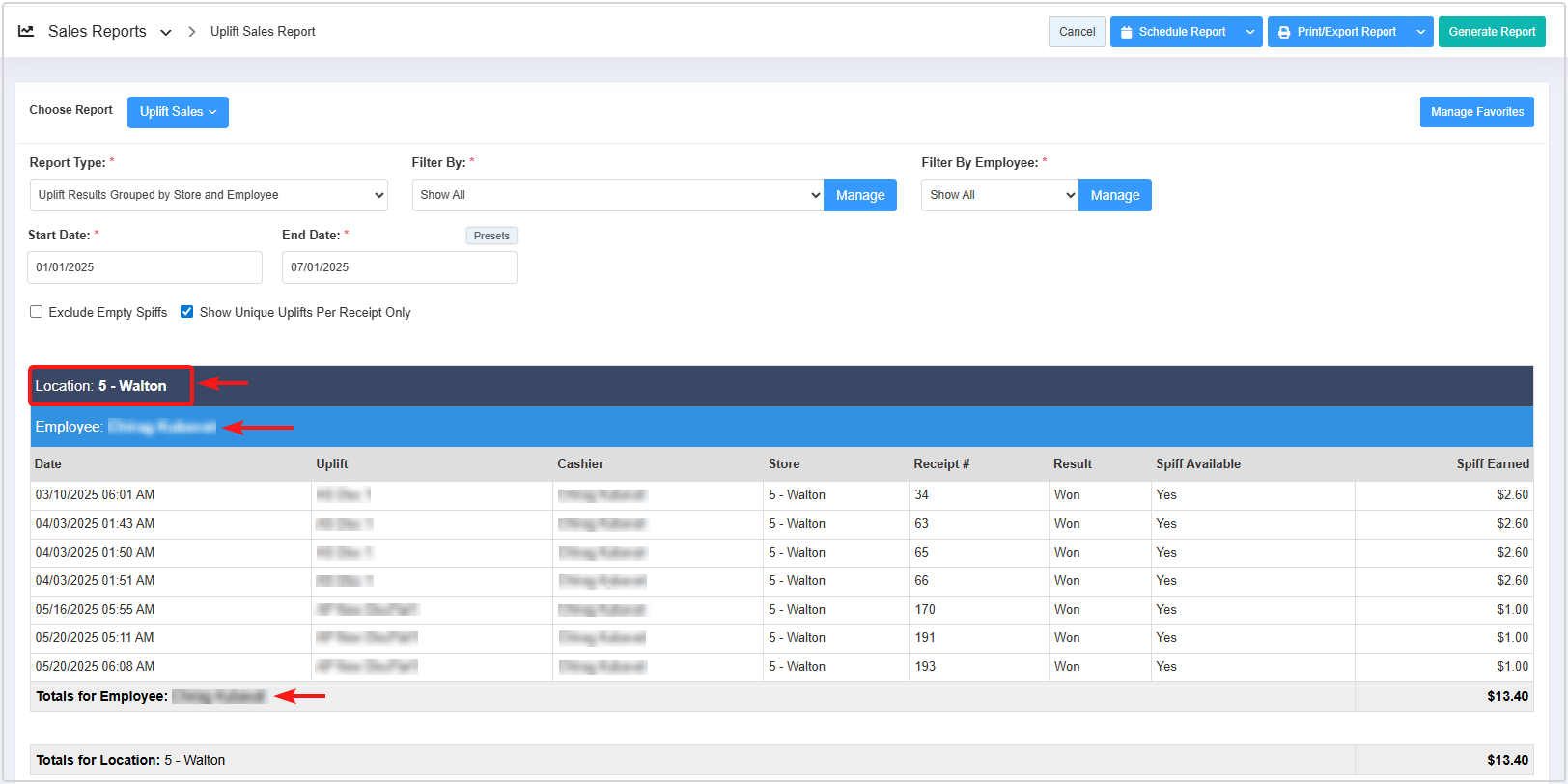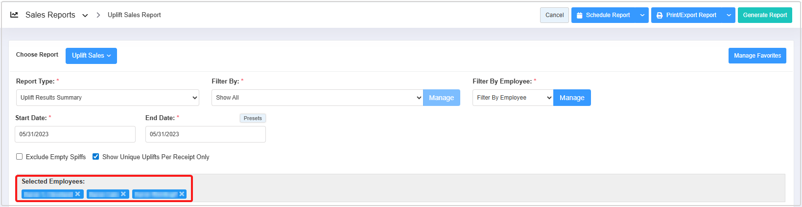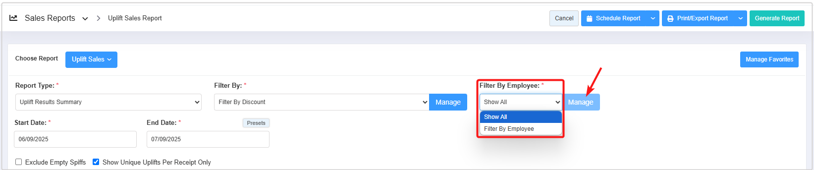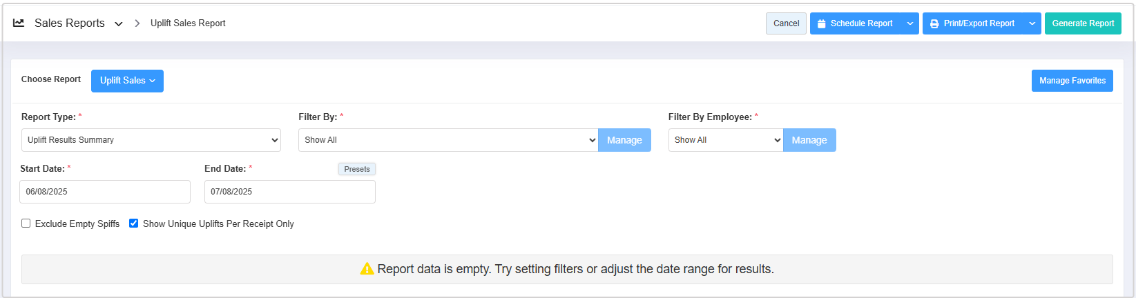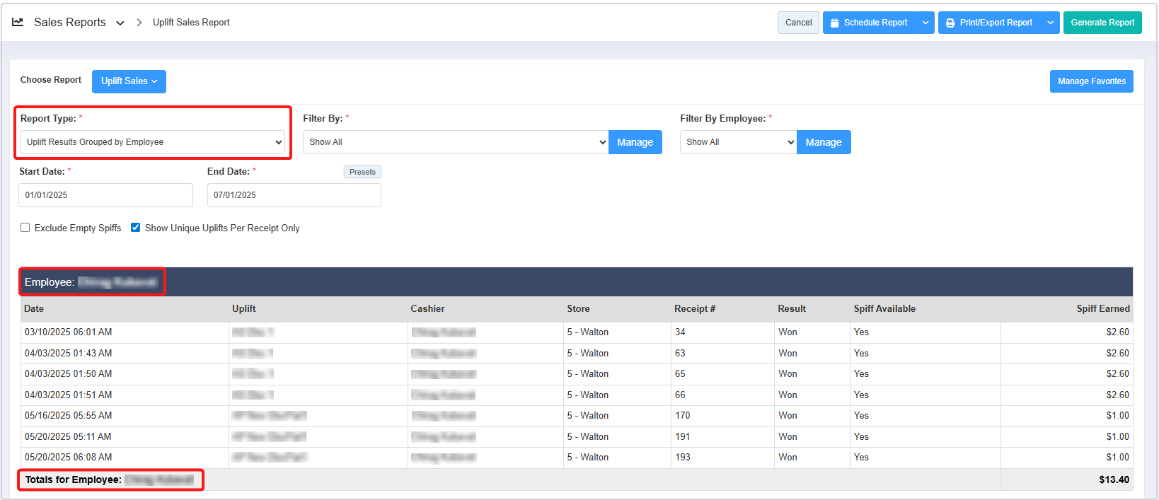 - Report Type: The Report Type filter lets you generate five types of reports: Uplift Results Summary, Uplift Results Detailed, Uplift Results Grouped by Store, Uplift Results Grouped by Employee, and Uplift Results Grouped by Store and Employee. 3.1 Report Type explains further details.