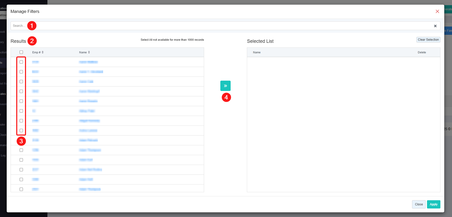 - 3: Selection Checkboxes: Select the required employees by checking the appropriate checkboxes.