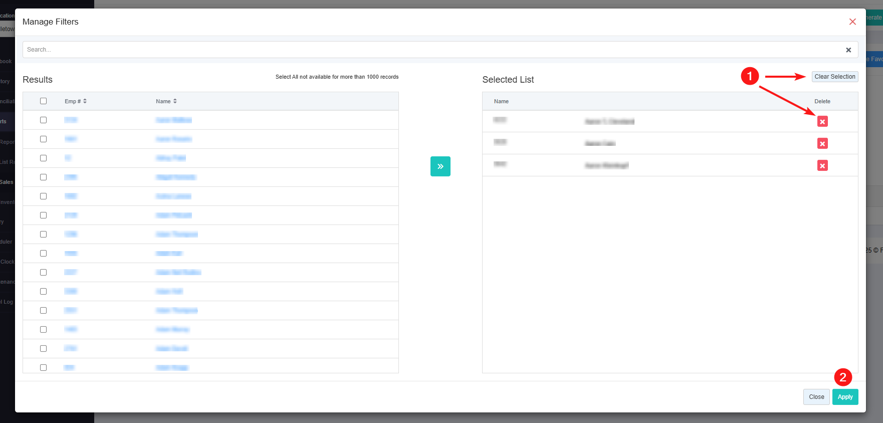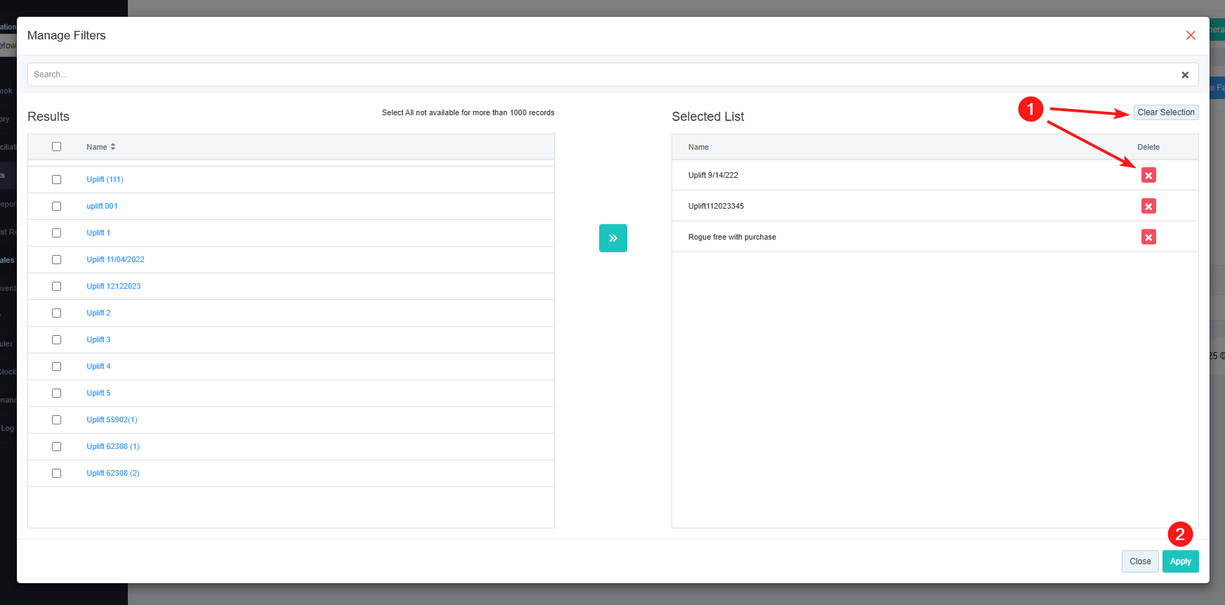 - 1: Clear Selection: Click the "Clear Selection" button to remove the whole selection. To remove any record from the list, click the Remove (x) icon.