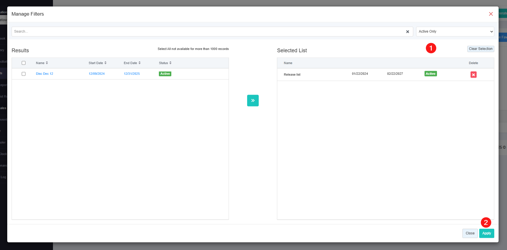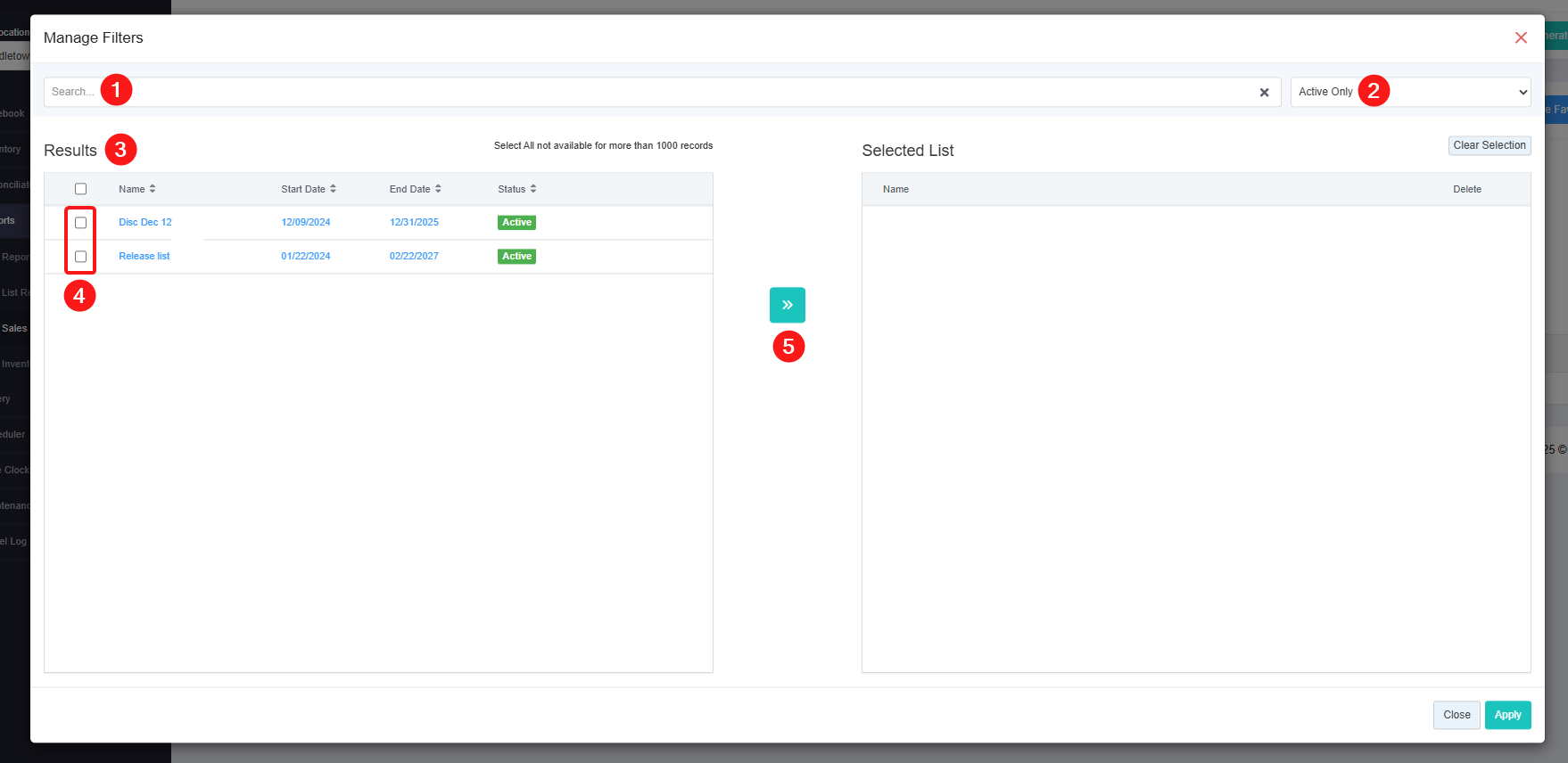 - 2: Active Only: Use this filter to filter the Manage Filters screen data based on four parameters: Active Only, Active & Current Only, Inactive Only, and All Records.