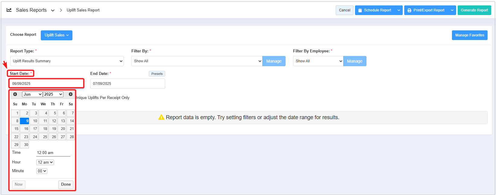 - Select the date range and click "Generate Report" to view the "Uplift Sales Report" for the selected date range.