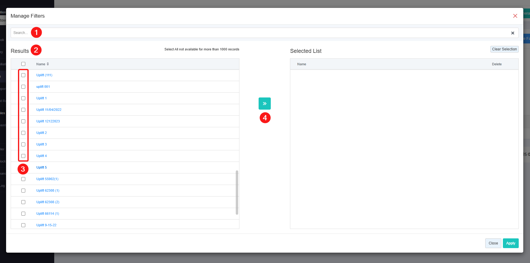 - Filter By Uplift: This option lets you view the report for the selected Uplifts. Please follow the steps below to select specific Uplifts.