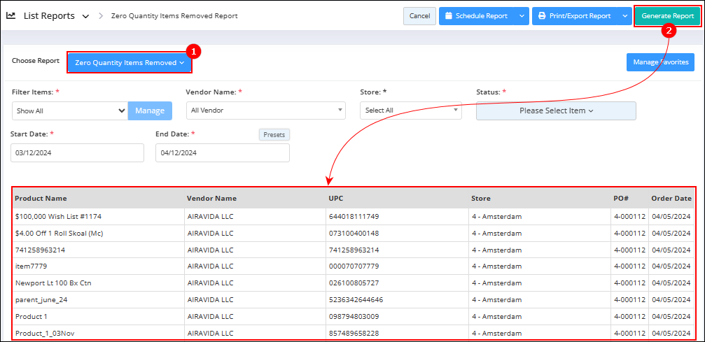 To reach the "Zero Quantity Items Removed Report," follow the below steps: